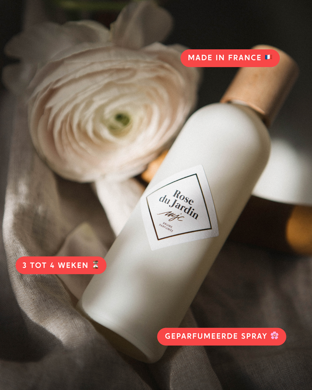 Met één enkele beweging verspreidt onze geparfumeerde spray Rose du Jardin onmiddellijk een langdurige geur. De lente in een parfum, waarin roos, pomelo en muskus samenkomen. Geniet tot wel 4 weken lang van een heerlijke geur.
